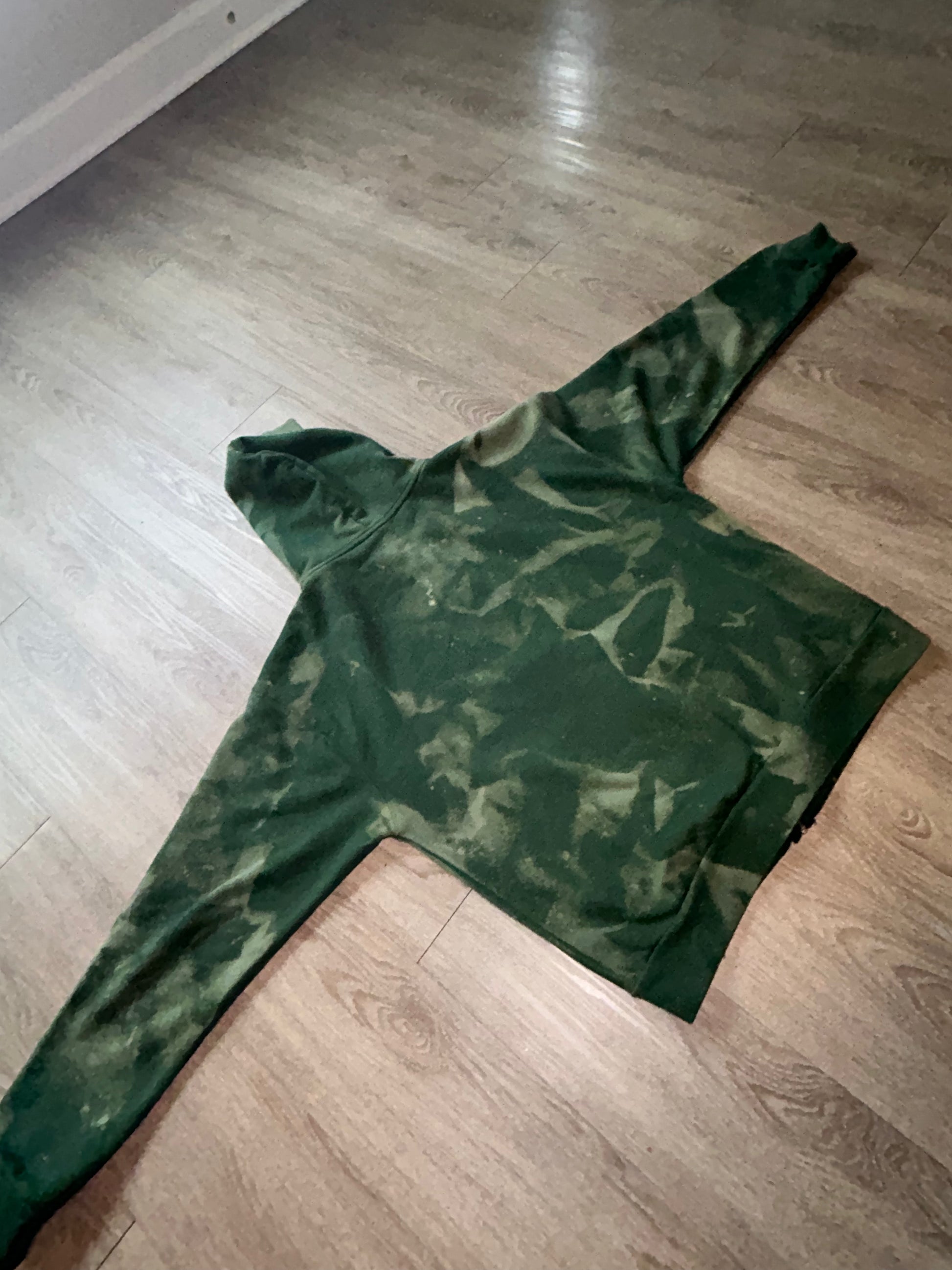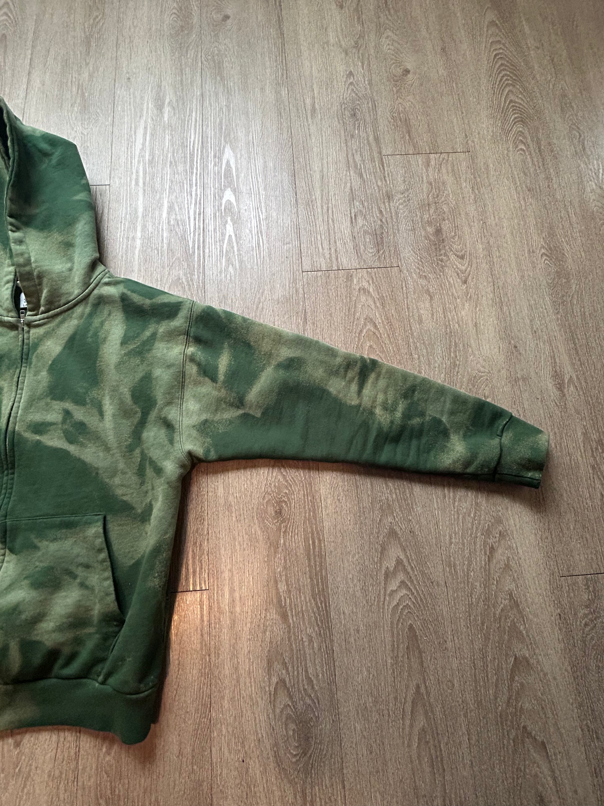 This forest green zip-up hoodie is constructed from a heavyweight 400 GSM fabric using an 80% cotton and 20% polyester blend. Each piece is individually hand-treated, creating natural variations that make every hoodie one of one. The process is done with care and control, preserving the integrity, strength, and wearability of the garment.
